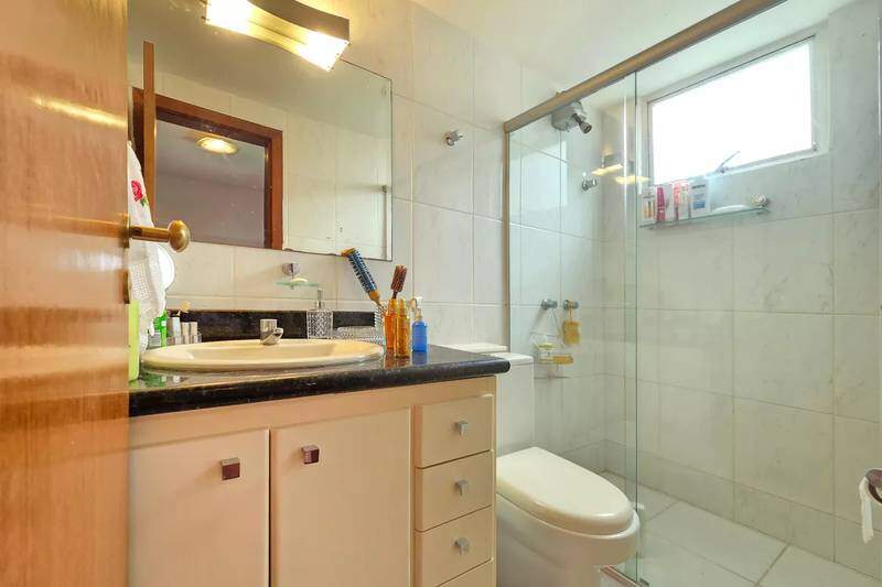 Banheiro social com espelho, bancada em granito, armários, bidê e box em blindex